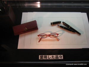 ガラスのケースに入った ご愛用のペンと赤いふちのめがねが飾られ